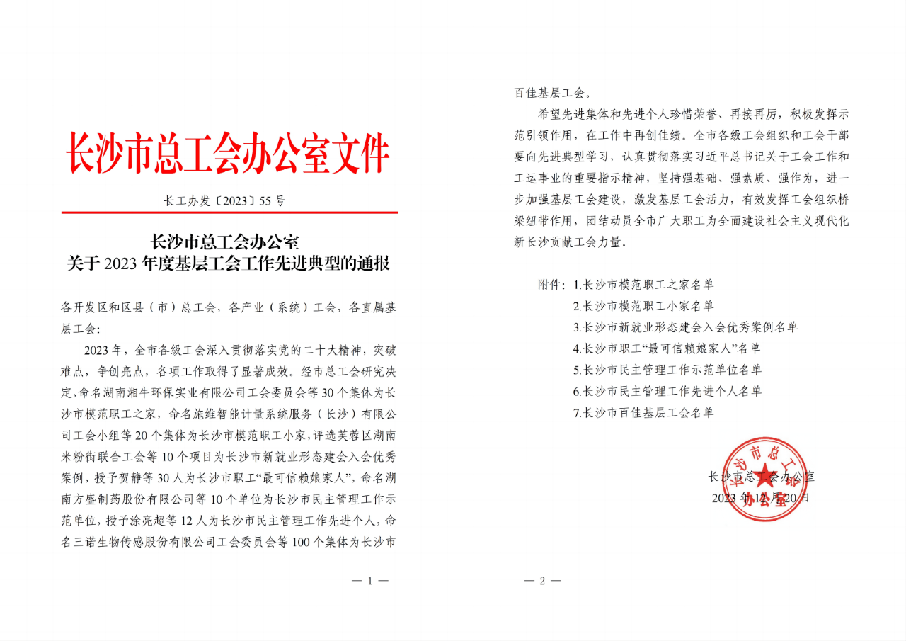 12月20日,长沙市总工会办公室印发《关于2023年度基层工会工作先进典型的通报》,评选和表彰了一批先进集体和先进个人,长沙城市发展集团有限公司工会委员会被命名为“长沙市百佳基层工会”。