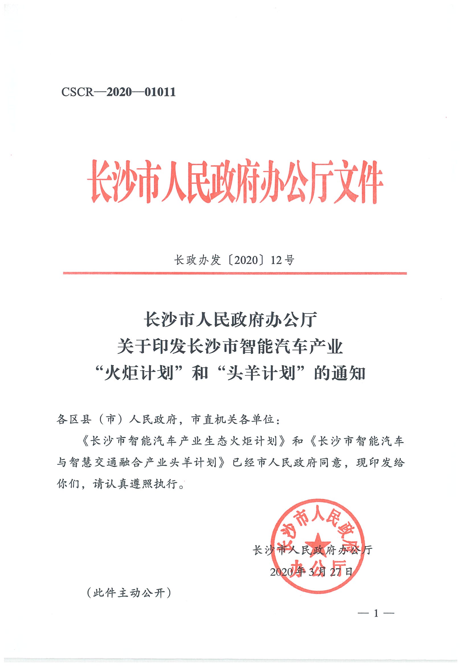 关于印发长沙市智能汽车产业“火炬计划”和“头羊计划”的通知(长政办发[2020]12号)